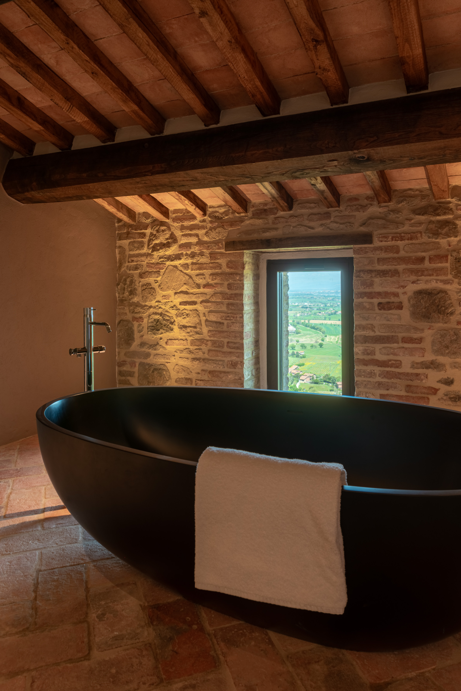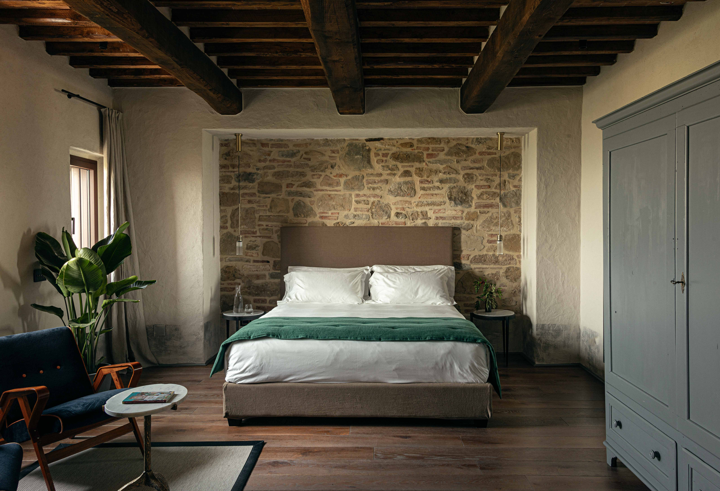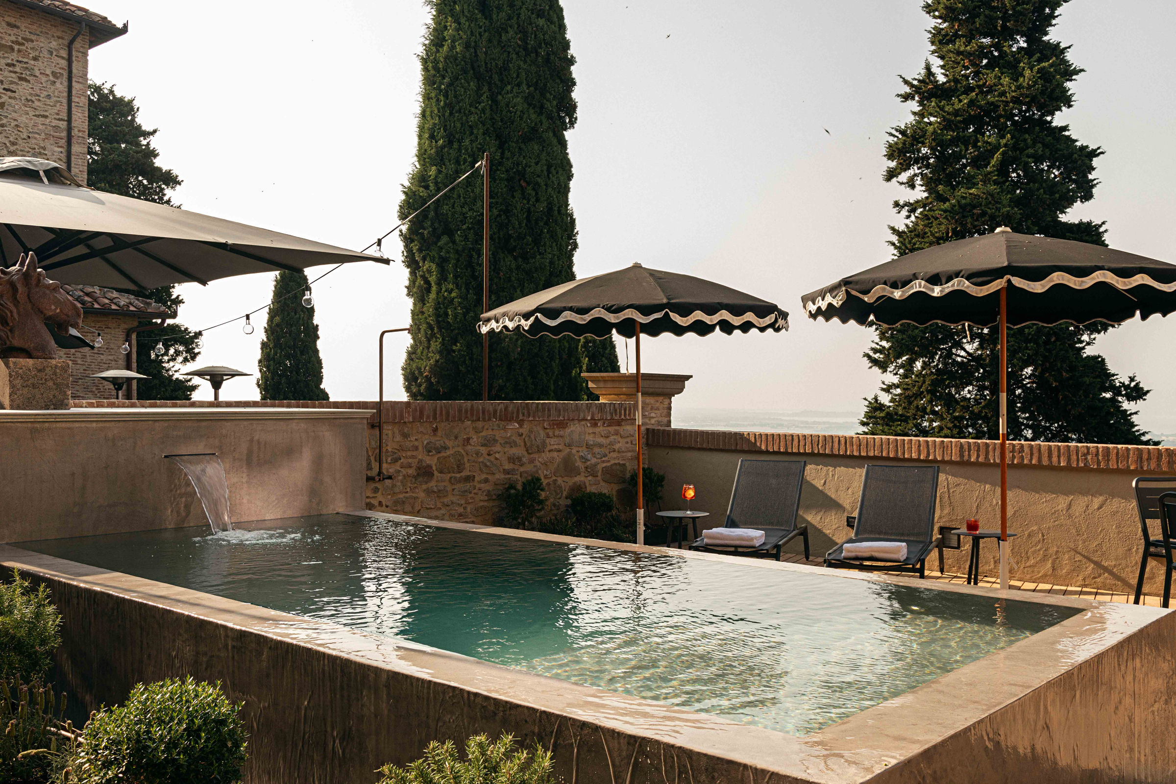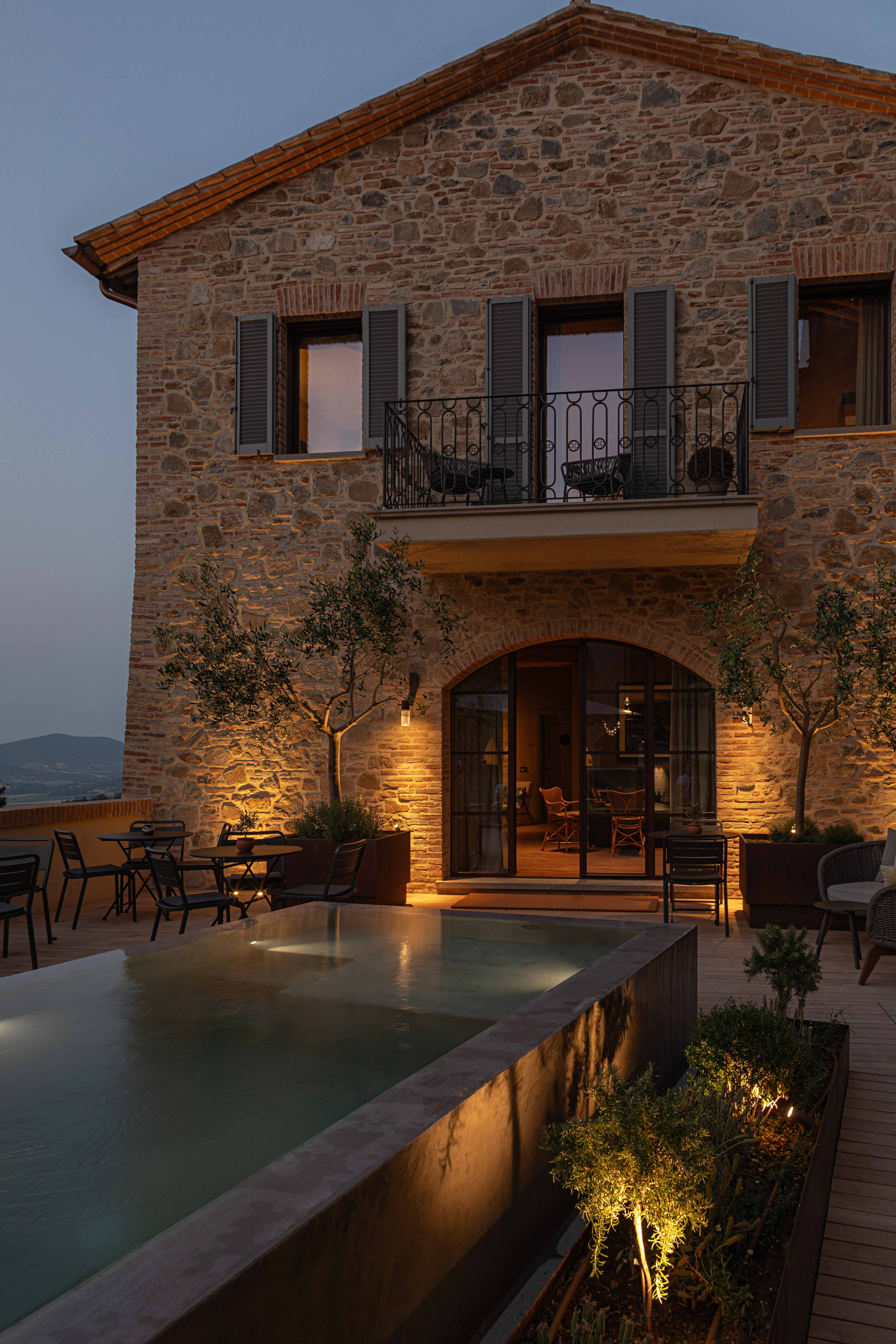 Wewnątrz hotel może się poszczycić odsłoniętymi kamiennymi ścianami i drewnianymi belkami, a każdy z 16 pokojów zapewnia cudowny widok na faliste wzgórza. Rozkosznie jest budzić się w nich co rano. Śniadanie na świeżo wyremontowanym tarasie napawa spokojem. Dźwięk wody w basenie, w którym można się schłodzić, to wszystko, czego ci trzeba.
