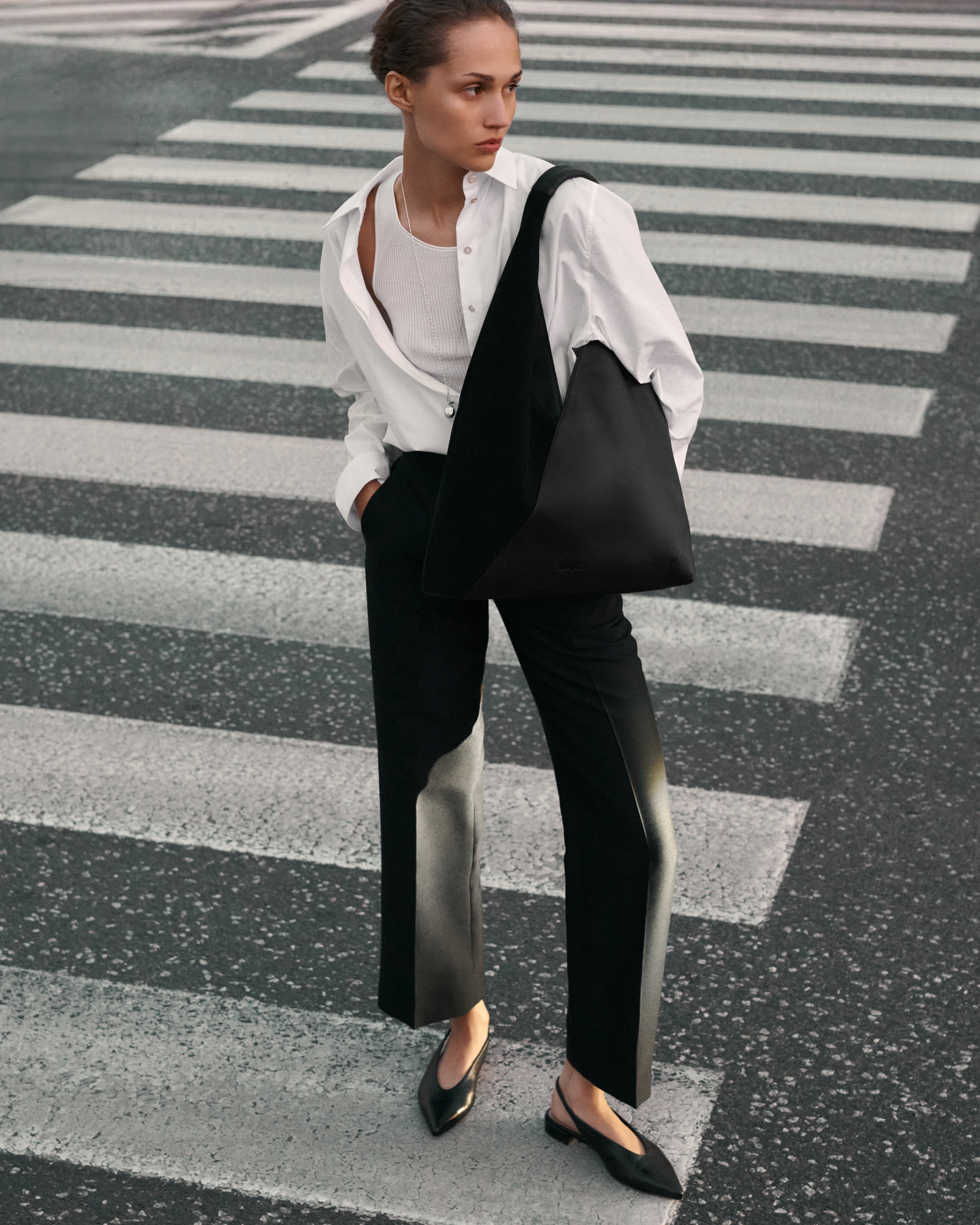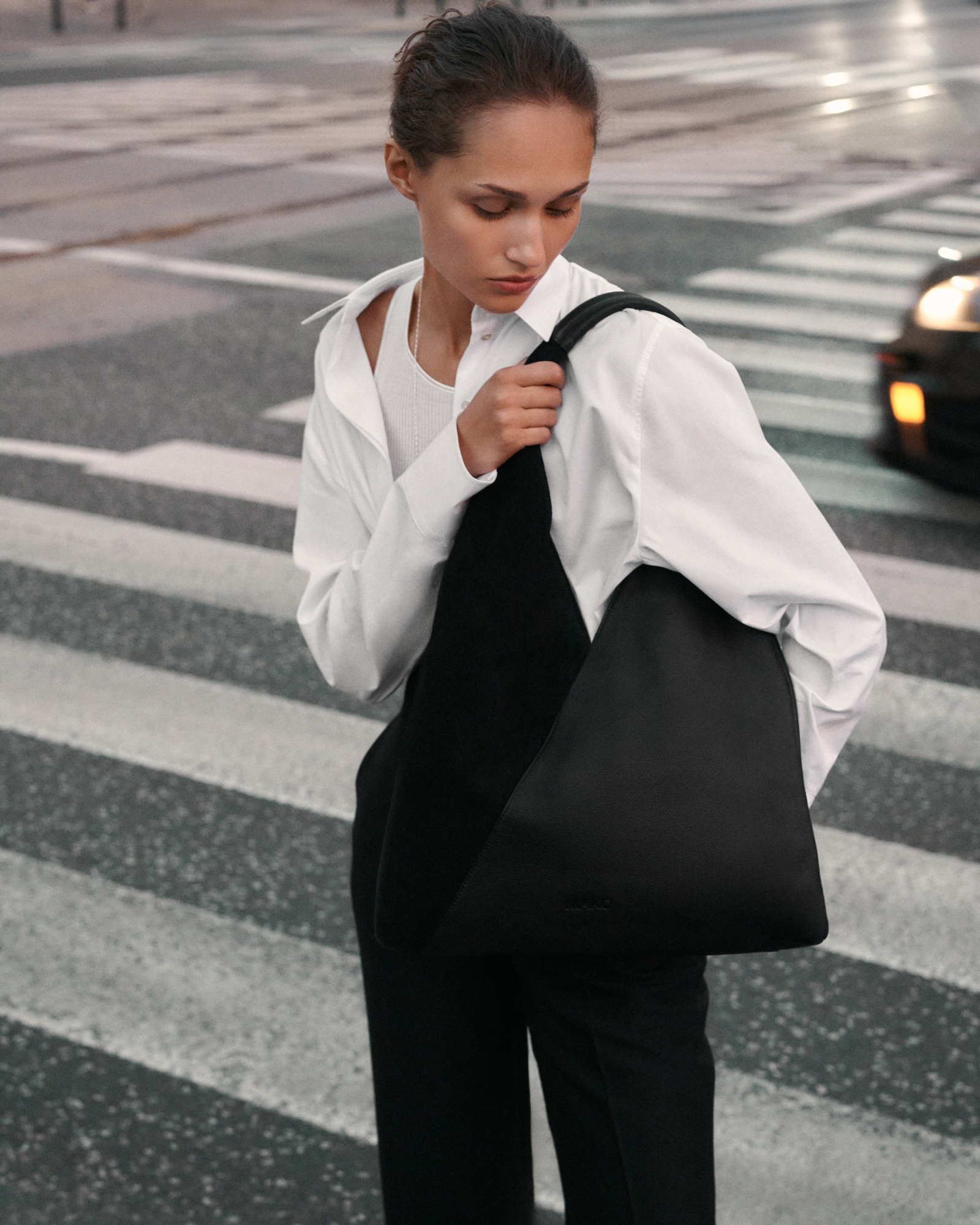 Nowe modele torebek balansują między swobodnymi formami a geometrycznymi kształtami. Luźna, uniseksowa torba na szerokim, regulowanym pasku wnosi do linii lekkość i nonszalancję. To projekt stworzony do życia w biegu. Z kolei nowy model trójkątnej shopperki z miękkiego zamszu zachwyca rzeźbiarską konstrukcją inspirowaną origami.