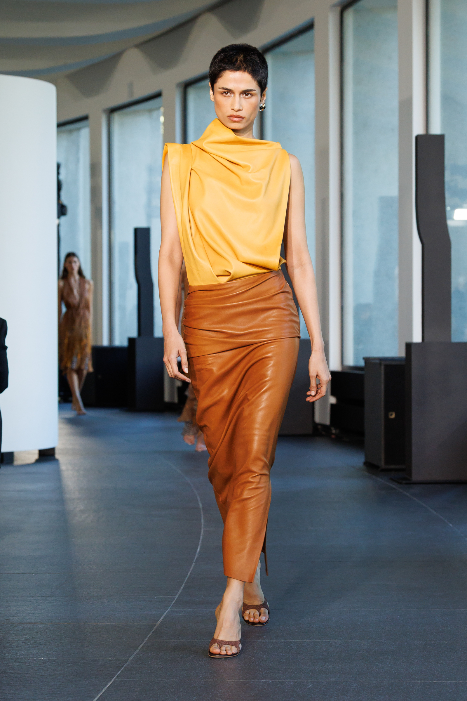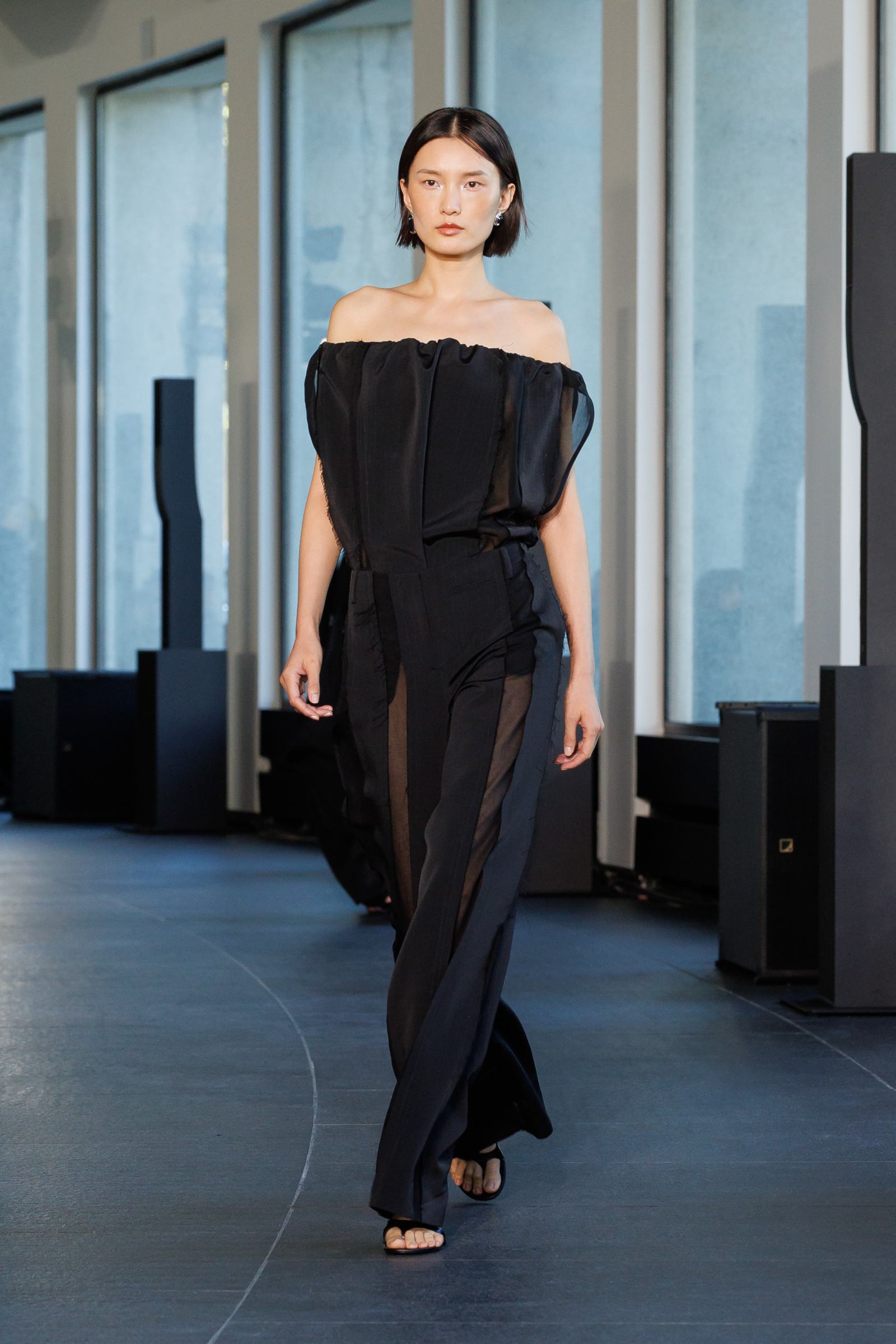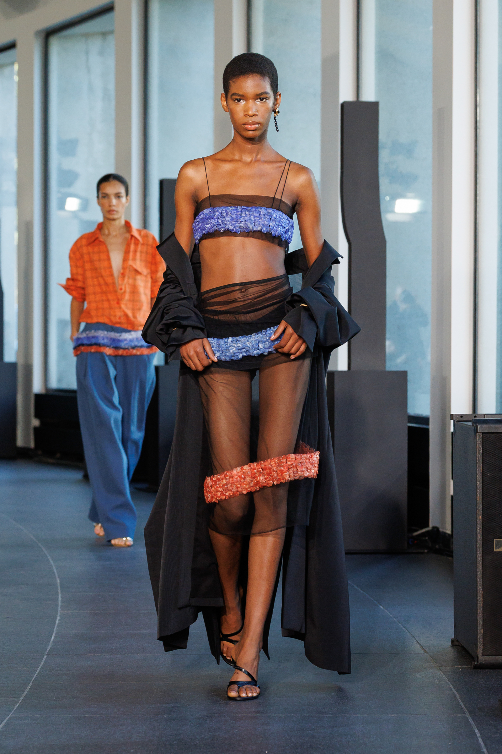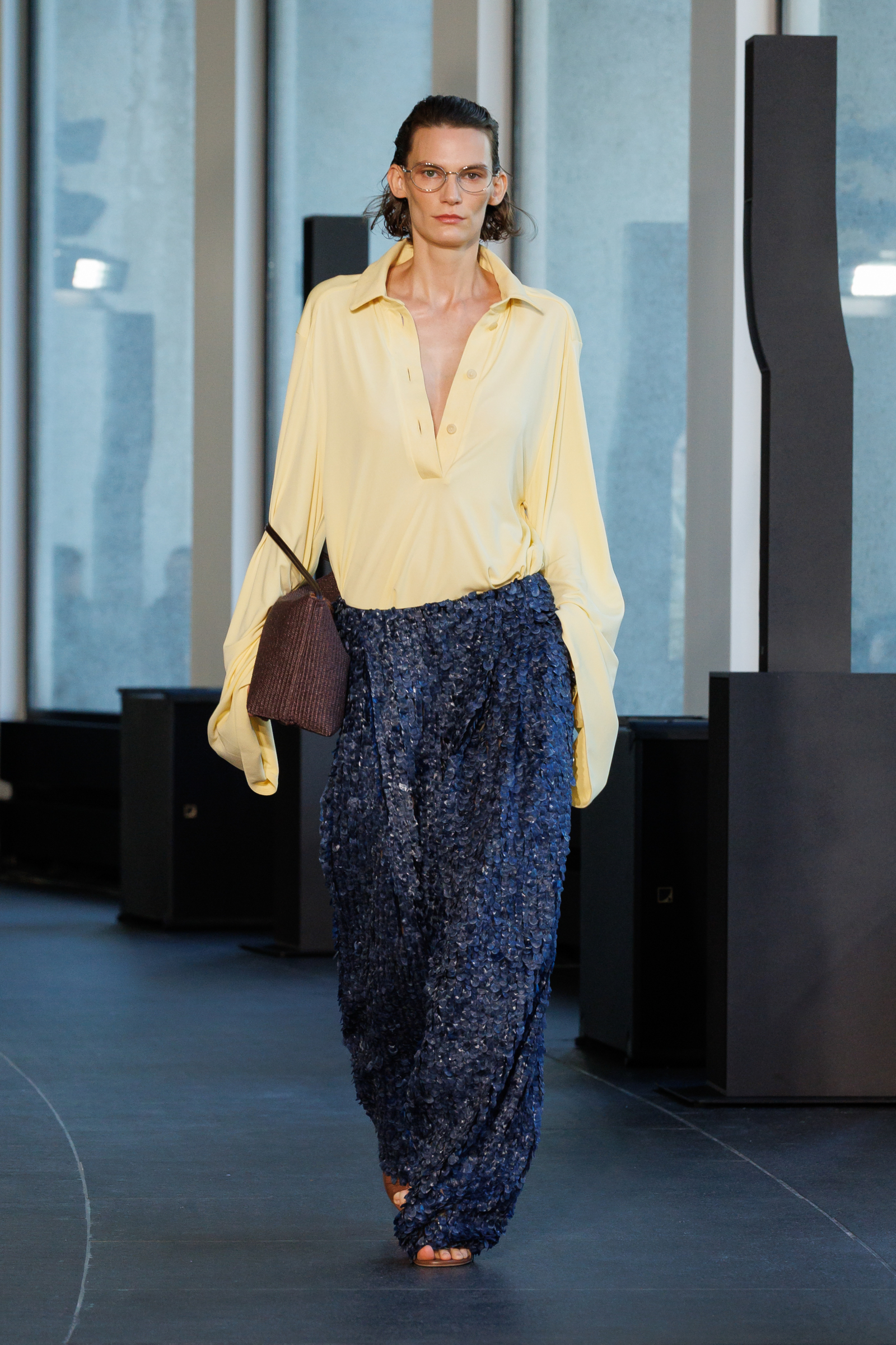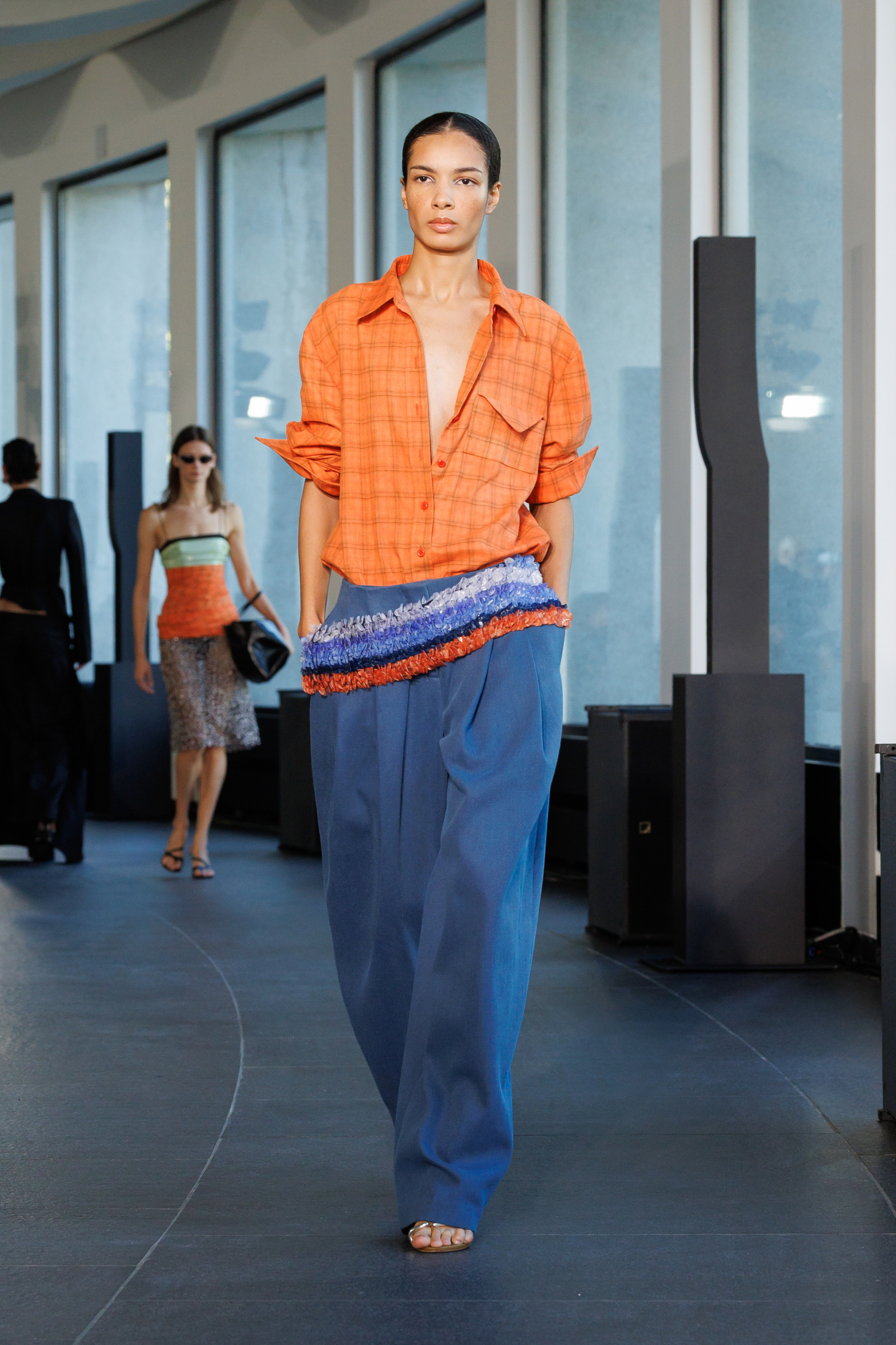 Kto by pomyślał, że luźne, cekinowe spodnie w granatowym kolorze będą tak dobrze wyglądać nie tylko w duecie z nonszalancką, casualową koszulą, ale i modelem w bananowym odcieniu żółtego? Decydując się na to kontrastowe zestawienie, Christopher Esber stworzył inspirujący dialog pomiędzy modą codzienną a wieczorową. To rozwiązanie z pewnością natchnie w przyszłym sezonie wszystkie fashionistki.