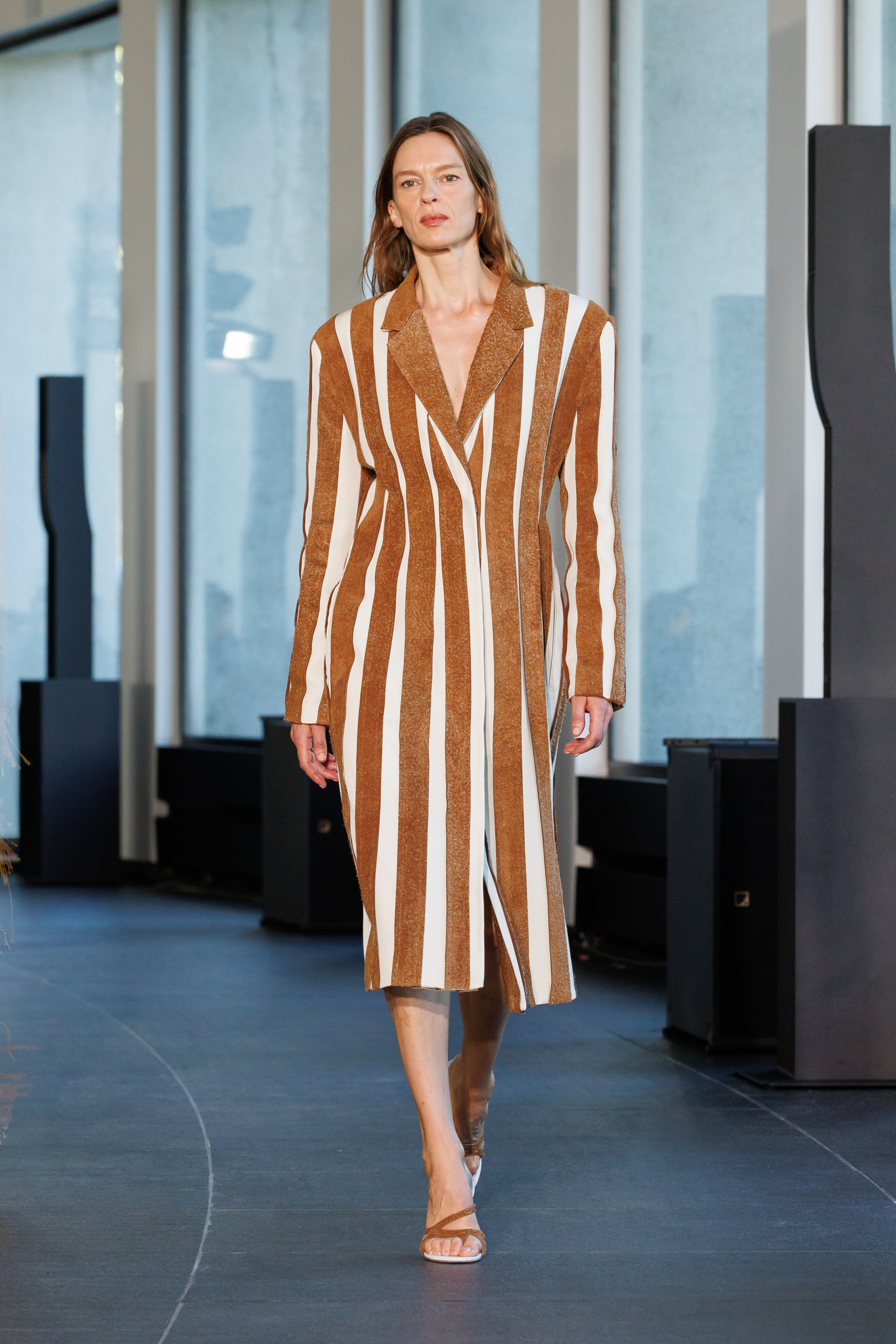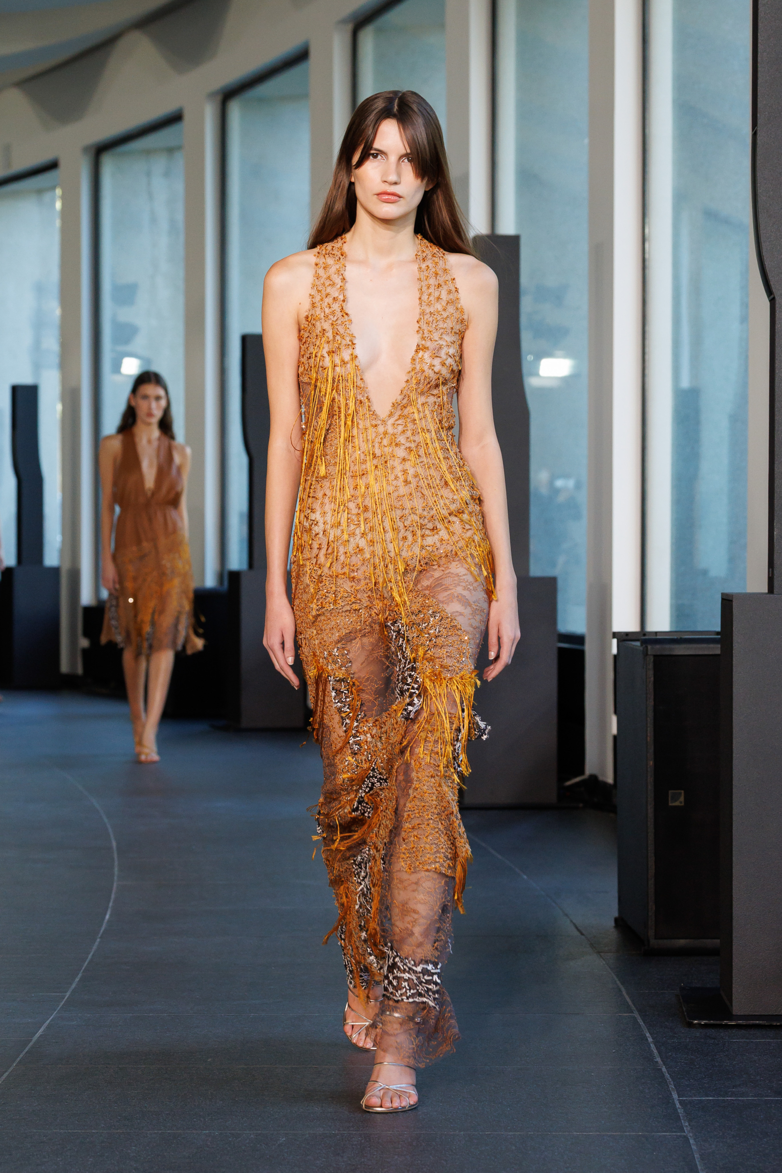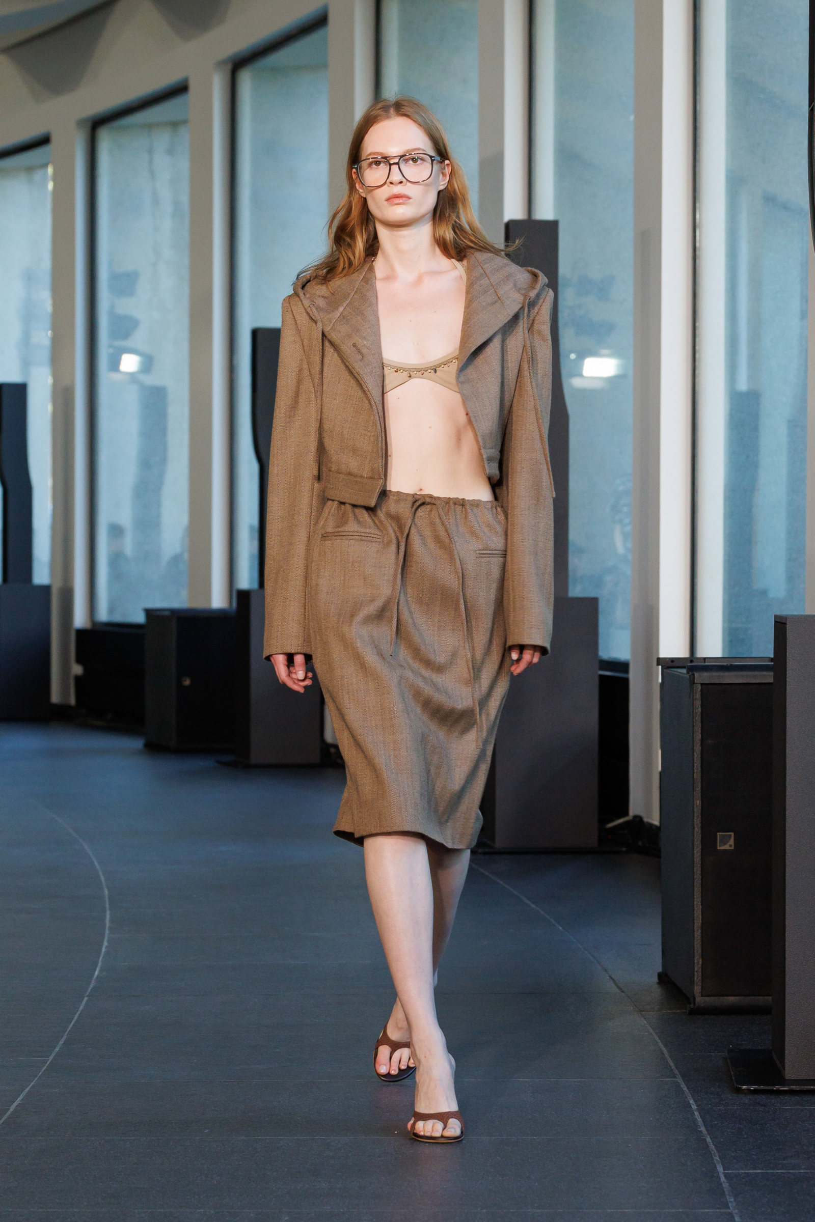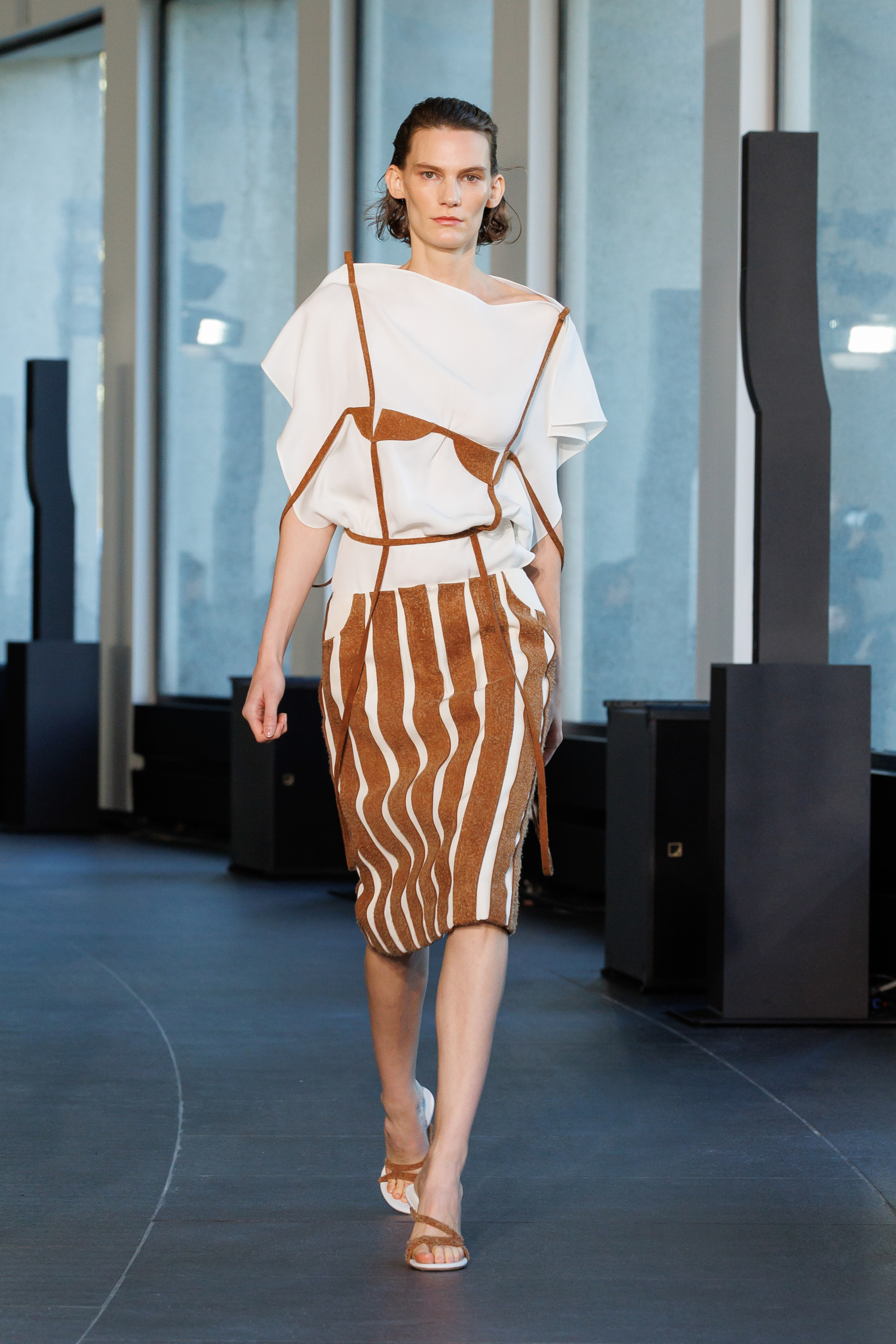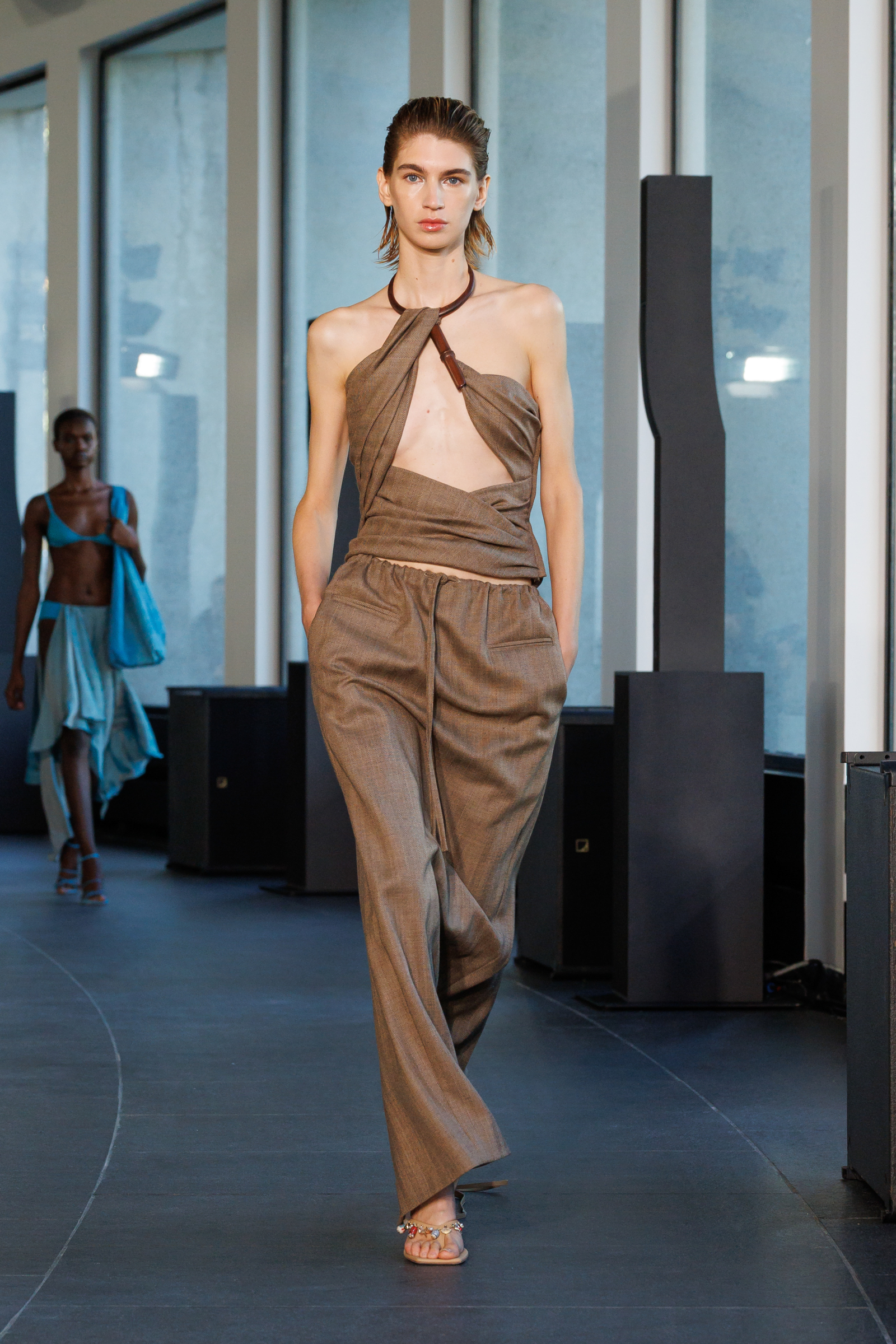Luźne, nonszalancko opadające na biodra spodnie w złamanym odcieniu brązu wiosną 2026 będziemy chętnie łączyć z t-shirtem lub koszulą. To zestaw idealny na co dzień, ale także do pracy. Nie porzucimy ich także w szczycie wakacyjnego sezonu. Zainspirowane pokazem Christophera Esbera dodamy do nich zmysłowy, ozdobiony elementami z drewna top z wycięciami, tworząc w ten sposób look idealny na gorące i pełne wrażeń letnie wieczory.