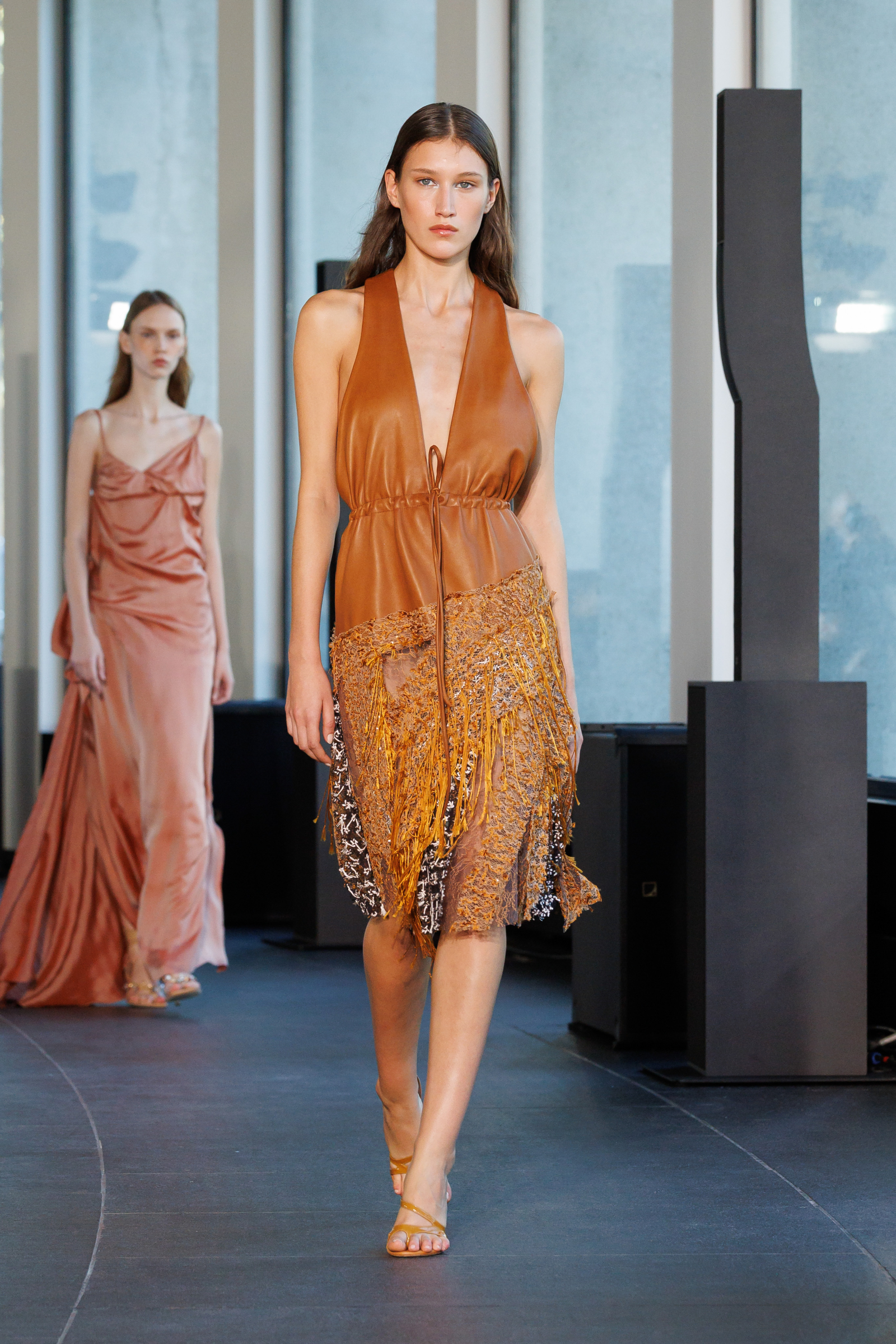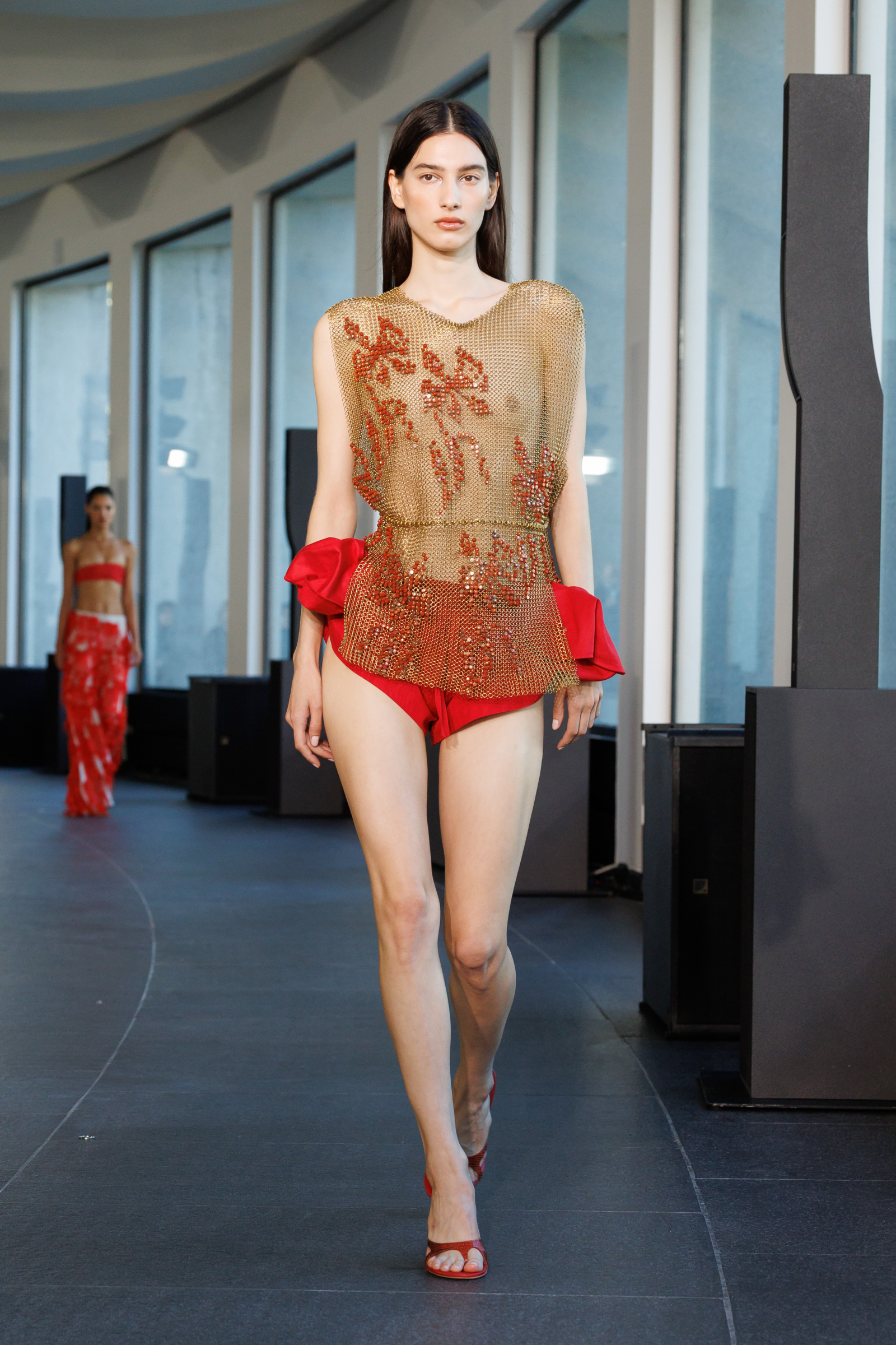 Projektant przy tym nie tylko po kojarzoną z wakacyjną beztroską kolorystykę – odcienie ziemi, soczysta pomarańcz czy czerwień – ale także materiały: bawełnę, len oraz szlachetne kamienie i drewno, z których tworzy rzeźbiarskie detale. Następnie, na zasadzie kontrastu, przełamuje je wykwintną i elegancką biżuterią w stylu retro, stworzoną przez markę Heaven Mayhem.