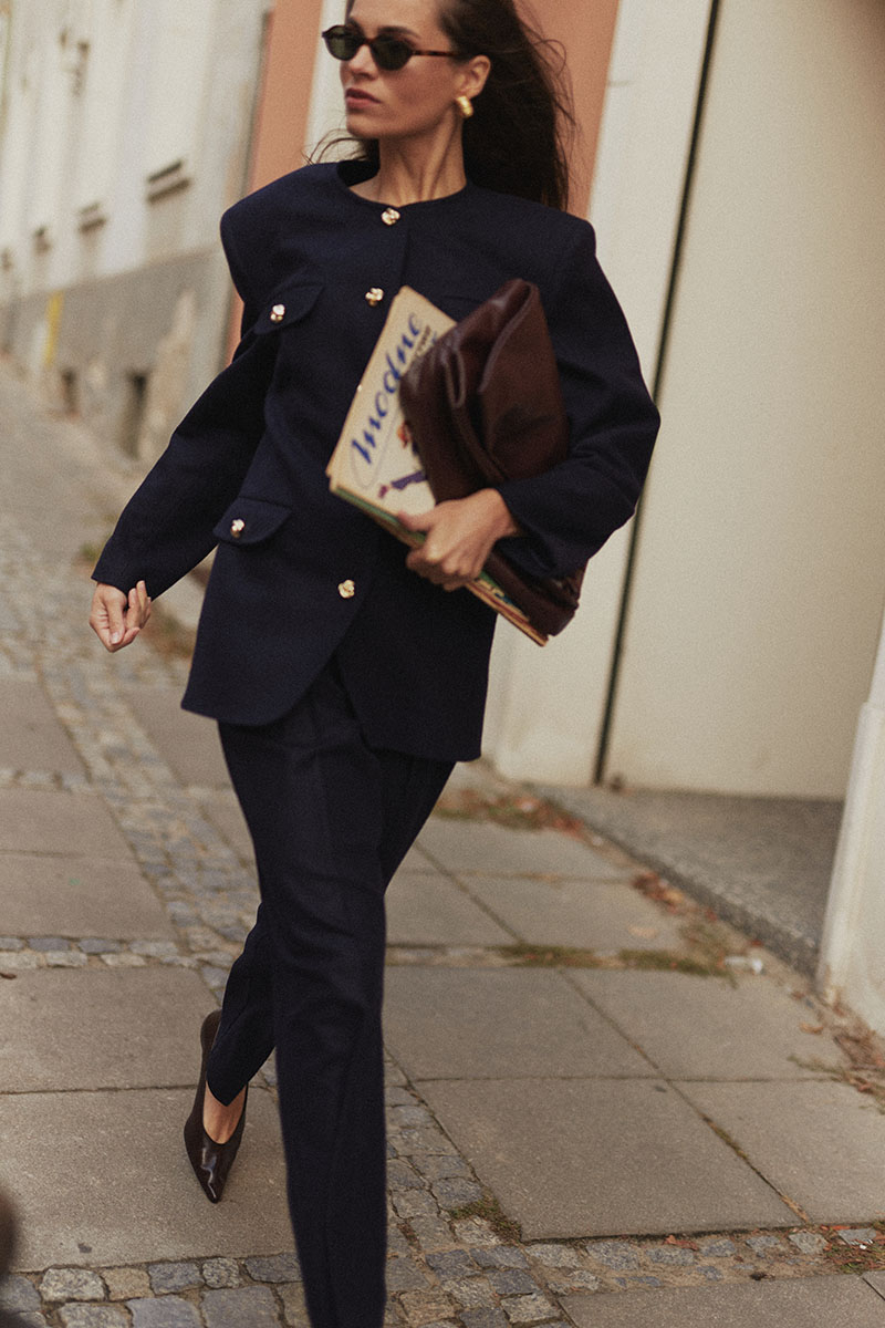 Rzuciła się więc w dalszy research. Zaczęła przeglądać pożyczone egzemplarze i internetowe archiwa gazet oraz zdjęć, wertować rodzinne zdjęcia z tego okresu i analizować własną szafę. – Zdałam sobie sprawę, że moje ulubione rzeczy – wielka i ciężka skórzana kurtka czy sukienka w grochy z poduchami na ramionach pochodzą właśnie z lat 90. – tłumaczy. Magda gros tych rzeczy kupiła przed laty w second handach i nosi je do dziś. Postanowiła wykorzystać je jako bazę do stworzenia ich współczesnych interpretacji. – Przypomniały mi się stare zdjęcia mojej mamy. Na jednym z nich, zrobionym na placu zabaw, ma na sobie białą garsonkę z długą, sięgającą za pośladki marynarką o prostej linii i prostą spódnicą za kolano. Kiedyś śmiałam się z podobnych stylizacji, uważałam je za niemodne, niewspółczesne. Dziś szalenie mi się podobają – tłumaczy. Podobny komplet, tyle że z wieloma złotymi guzikami-węzełkami, kieszeniami i z tkaniny nawiązującego do chanelowskiego boucle, to jeden z jej ulubionych elementów kolekcji Madelle na jesień-zimę 2025. Stworzyła go też w granatowej wersji. – Obie doskonale wyglądają zarówno z pasującą spódnicą, jak i z czymś zupełnie casualowym, jak jeansy – dodaje. Po ponad trzech latach prac udało jej się wprowadzić do kolekcji denimowe spodnie, które od razu zachwyciły klientki. – Mają naprawdę fenomenalny krój. Są dopasowane w talii i na biodrach, mają proste nogawki, które kładą się na butach, wysoki stan i świetnie podkrojony tył, dzięki czemu wspaniale podkreślają pośladki – tłumaczy. Pasują do pastelowych sweterków i wzorzystych bluzek Madelle z tego i poprzednich sezonów.