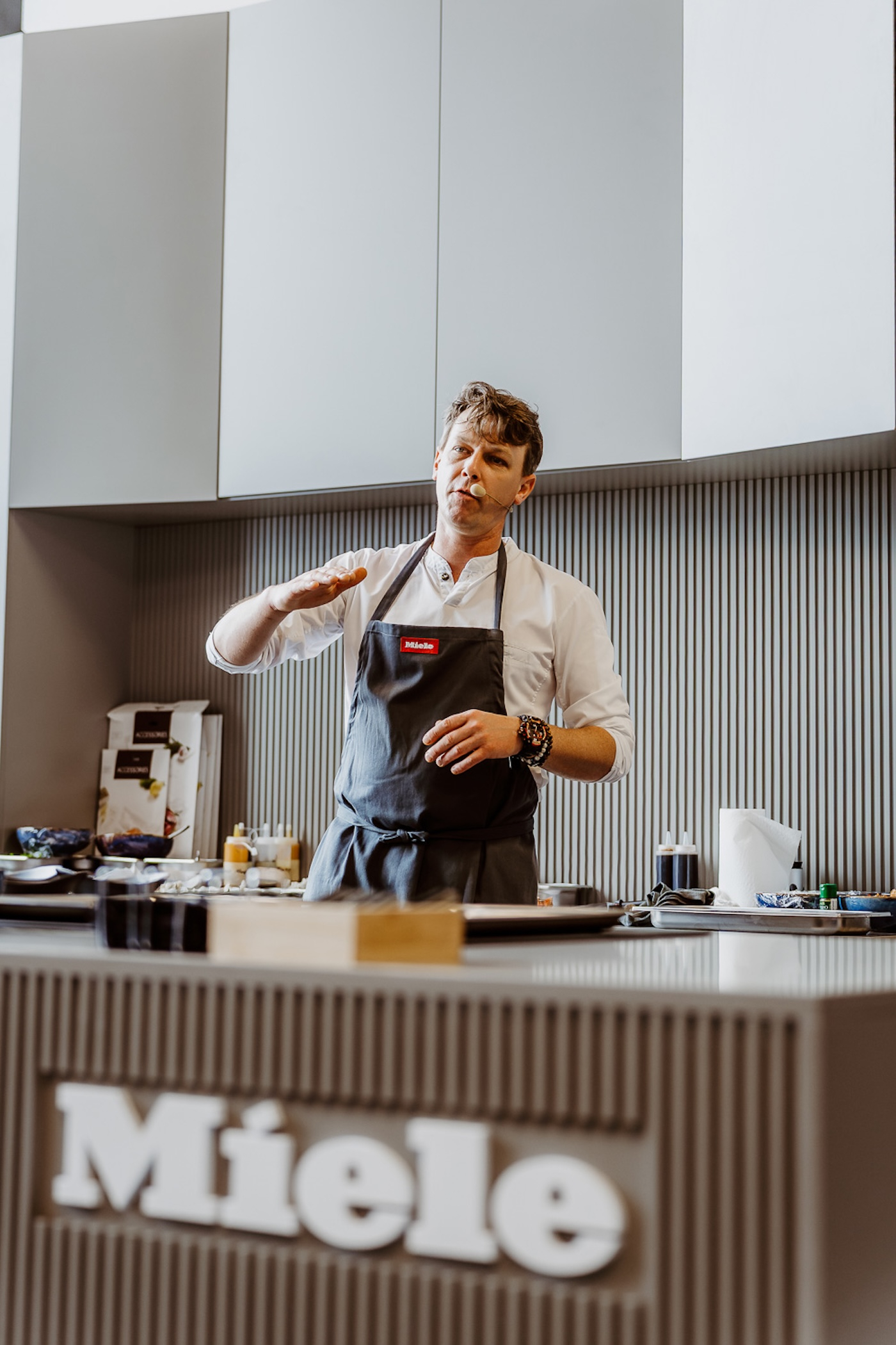 Urządzając kuchnię, myślimy nie tylko o funkcjonalności, lecz także o estetyce. Dlatego ważne jest, by sprzęty, które się tam znajdą, współgrały z całością pomieszczenia i jego pozostałym wyposażeniem. Na scenie kulinarnej Miele Brand Days zaprezentowano linię urządzeń do zabudowy w neutralnym, ciepłym kolorze Pearl Beige. A o tym, jak produkty marki Miele sprawdzają się w praktyce, można było się przekonać podczas pokazów kulinarnych. Prowadził je Dominik Narloch – szef kuchni Miele z poznańskiej restauracji Zen On wyróżnionej w przewodniku Michelin.