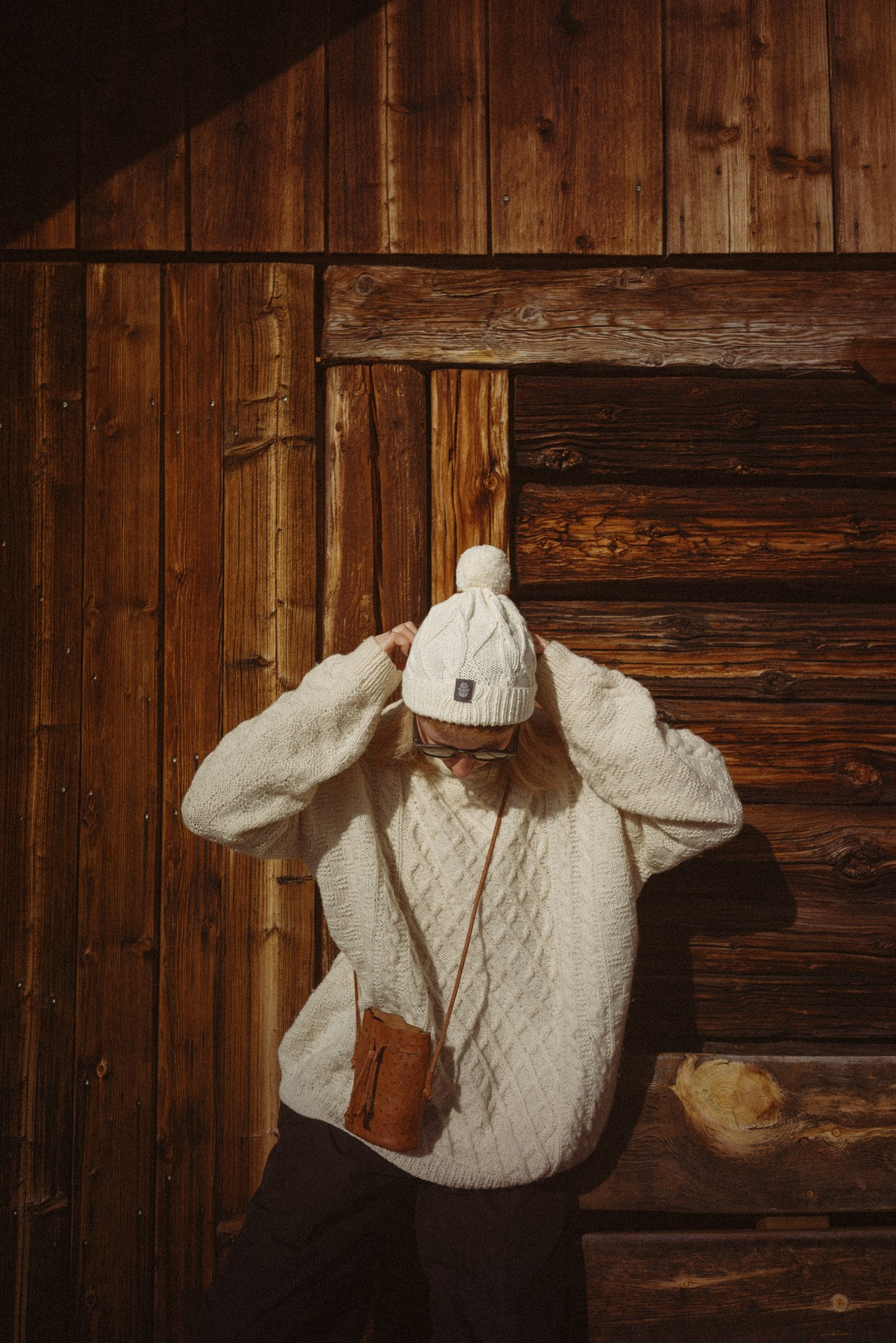 – Teraz szukaliśmy przestrzeni i spokoju, miejsc, w których życie toczy się niezmiennym rytmem – tłumaczy Iwanina-Kochańska. Z rozmysłem wybrali gospodarstwo pełne zwierząt – krów, kur i kotów, z końmi i pszczołami po sąsiedzku. – Wszyscy wstają tu razem ze słońcem, które szybko chowa się za górami. Natura dyktuje rytm i determinuje sposób funkcjonowania. W krajobrazie znalazłam ukojenie – opowiada. Podczas tego pobytu nie zamierzała pracować, ale urzeczona miejscem, mimo że nie zabrała ze sobą znacznej części nowej kolekcji, zdecydowała, że to ten czas i miejsce. – Zależało mi, żeby na zdjęciach słychać było ciszę – opowiada poetycko. Ten klimat pasuje do wartości jej marki, też w znacznej mierze niezmiennej. Już od 14 lat Roboty Ręczne działają pod prąd, promując rękodzielnicze tradycje i klasyczne wzornictwo na lata. – Wprowadzamy nowe wzory, ale niezmiennie czerpiemy z dziewiarskich tradycji. Wprowadzamy inne kolory przędz, eksperymentujemy z nowymi modelami, ale one wciąż osadzone są w wełnianej klasyce, lekko zaadaptowanej do współczesności – tłumaczy, wskazując na golf z bufiastymi rękawami i dużą kamizelkę idealną do budowania jesiennych warstw. Na obu modelach widać piękne warkocze, ulubione sploty ryżowe i plastry miodu po mistrzowsku wyrobione z włóczek w neutralnych kolorach. Widać tu też szale o strukturze boucle i misternie dziergane kapturki – w tym sezonie nowe, zakończone długimi wąskimi szalikami, które można owinąć wokół szyi. Alternatywą dla nich są ażurowe czepki dziergane z alpaki z włosem albo z bawełny w wariancie całorocznym. W kolekcji nie mogło zabraknąć nowych kolorów wełnianych skarpet, tym razem także wykończonych falbanką, i kapci z owczej skóry, które od lat pozostają bestsellerem Robotów.