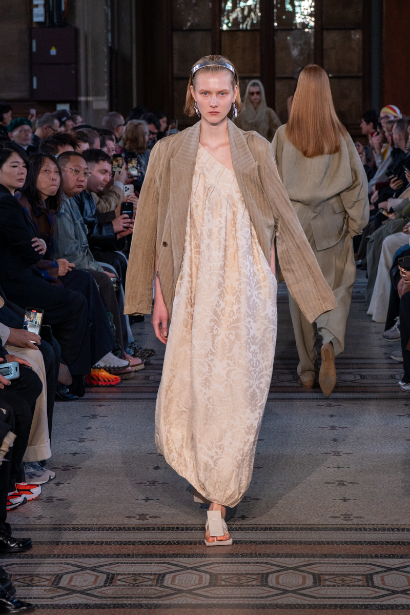 Uma Wang ponownie eksploatuje relację pomiędzy nowością a tym, co stare, wręcz znoszone. Materiały zdają się „być już użyte” – lniane płótna o pergaminowej teksturze, jedwabie o lekko rozmytym połysku, przetarte tkanki, przeszycia, marszczenia – wszystko zostało stworzone tak, by nawet w najprostszym fasonie snuła się jakaś opowieść.