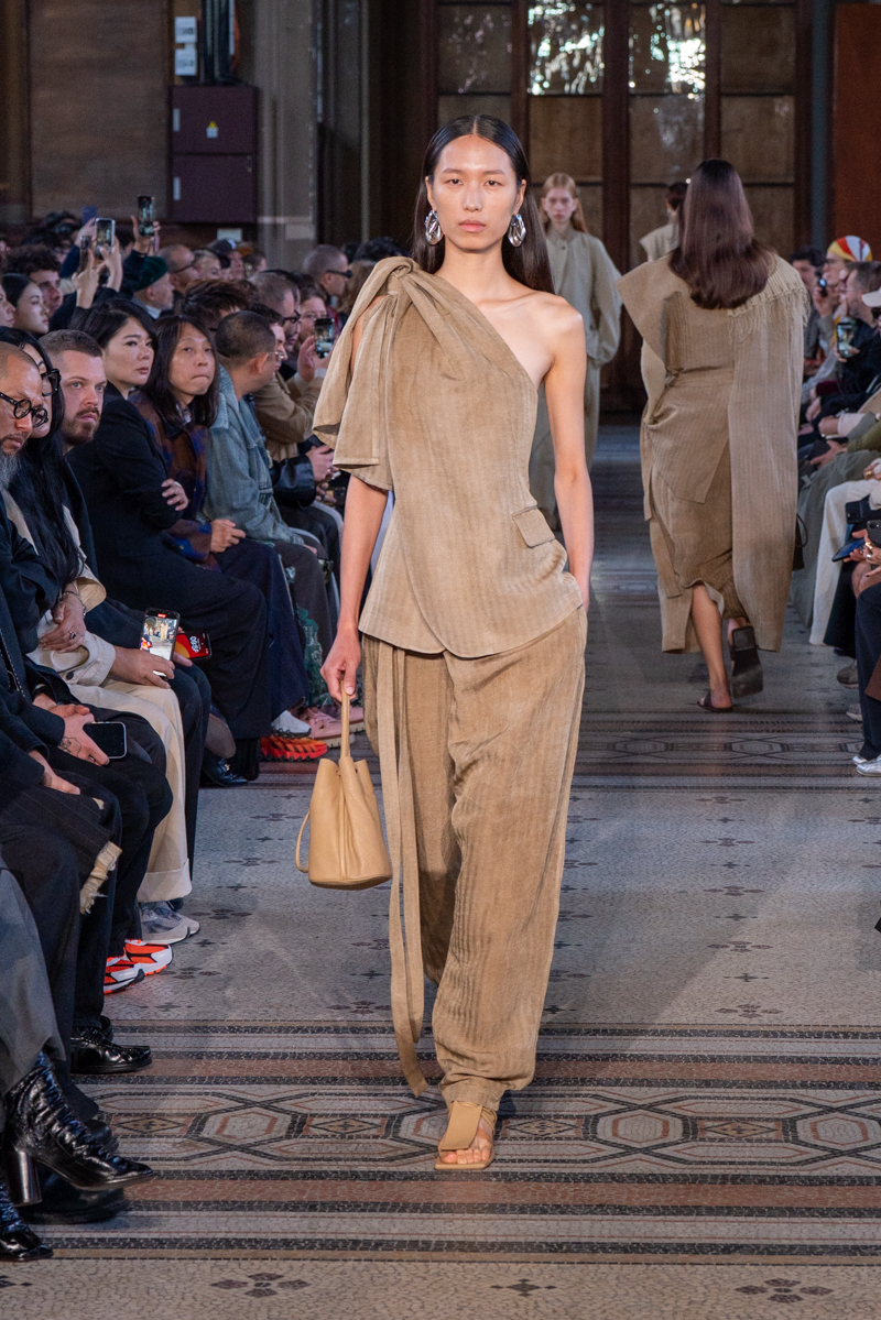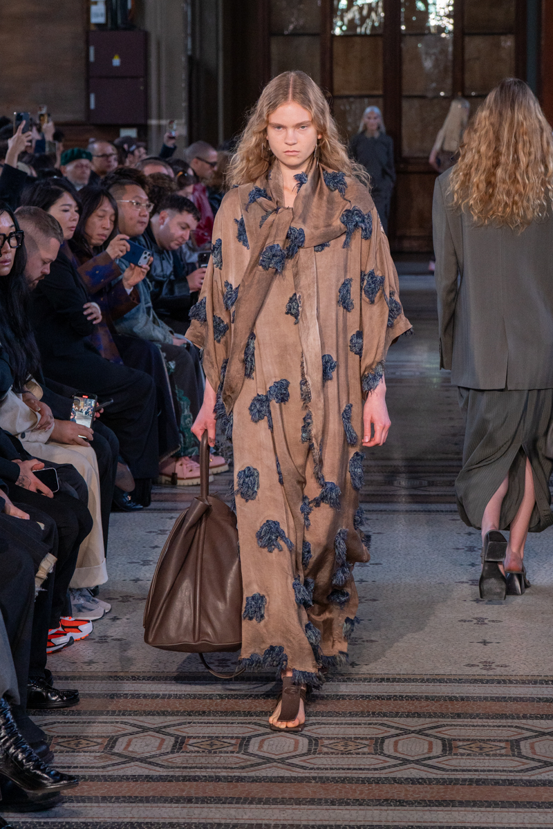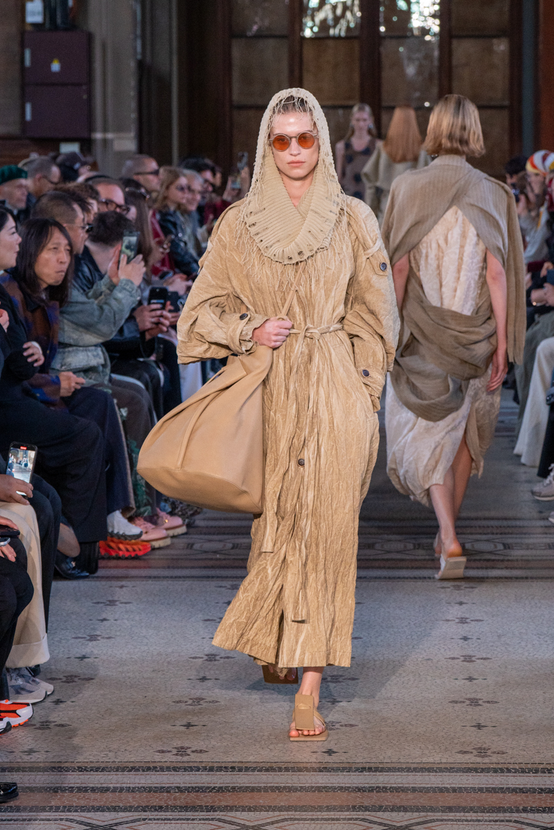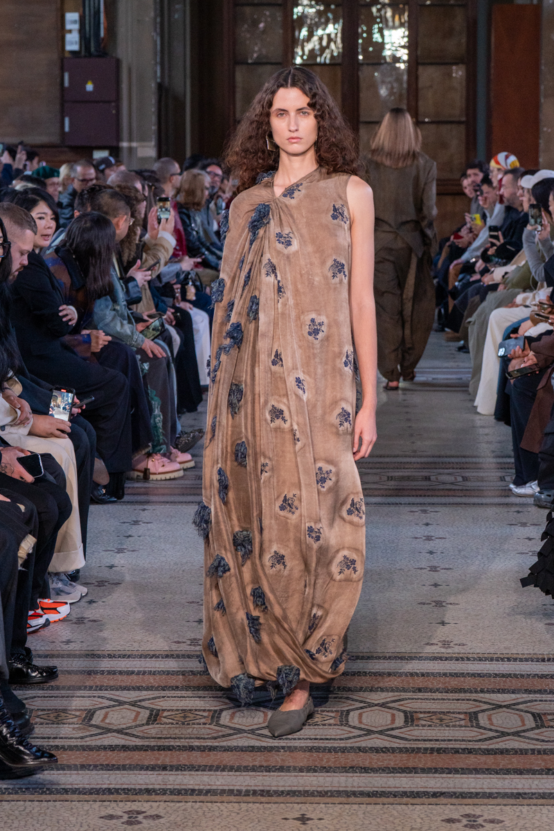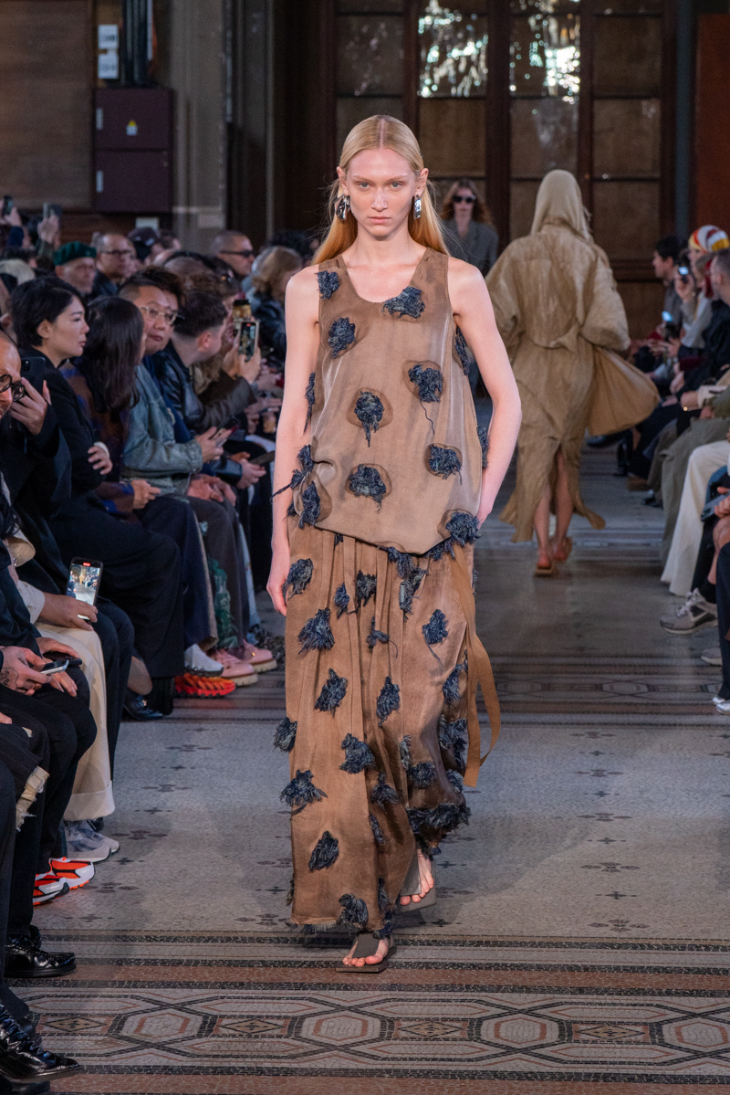 W kolekcji nie zabrakło także warstwowych stylizacji – luźnych garniturów czy sukienek z dekoracjami. Formy, które przypominały ciężkie elementy garderoby, zostały uszyte z lekkich, zwiewnych tkanin, co nadało im zupełnie nowy charakter. Wśród kolorów dominowała paleta barw ziemi, odrobinę uszlachetniona metalicznym połyskiem.