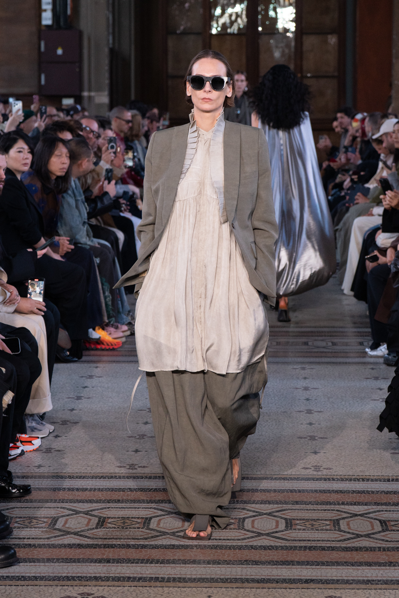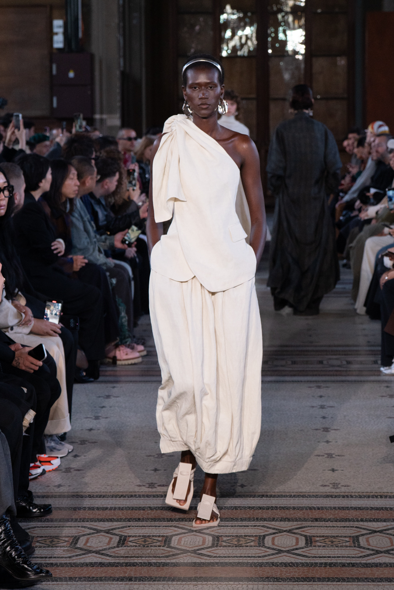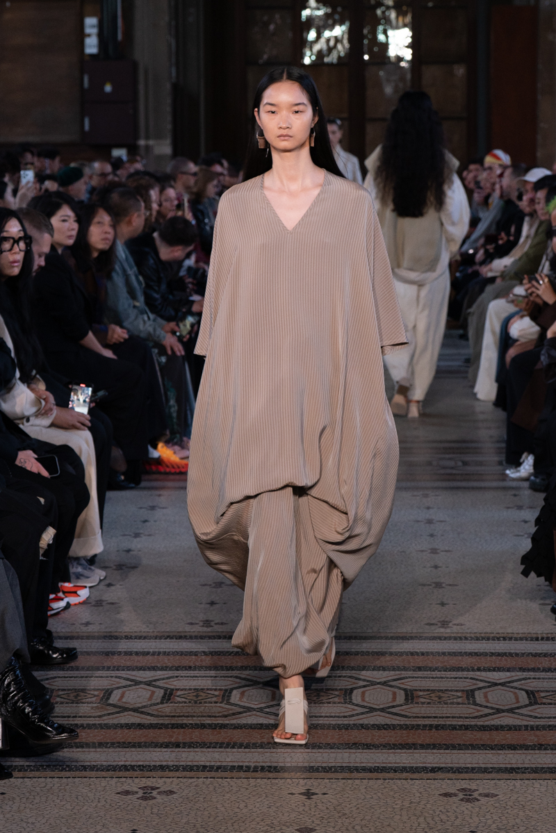W prezentacji kolekcji Umy Wang na sezon wiosna-lato 2026 dało się wyraźnie odczuć, że zobaczymy pokaz subtelny i przemyślany, w którym to ubrania będą grały pierwsze skrzypce. Cisza panująca w dawnej industrialnej przestrzeni i dyskretne światło wpadające przez okiennice bardziej niż typowy przepych paryskich wnętrz przywodziły na myśl atmosferę ascetycznej świątyni. Nawet publiczność w odróżnieniu od innych pokazów zamiast typowego gwaru wybrała ciszę.
