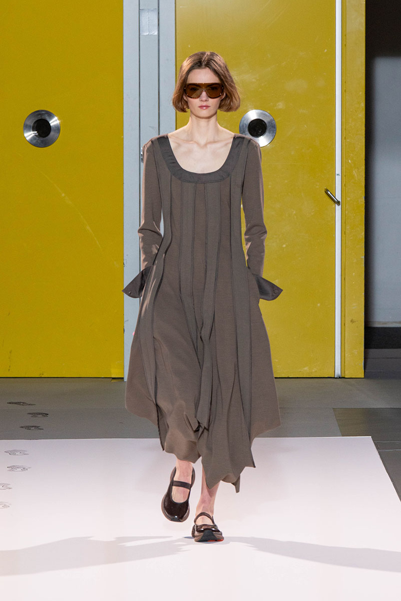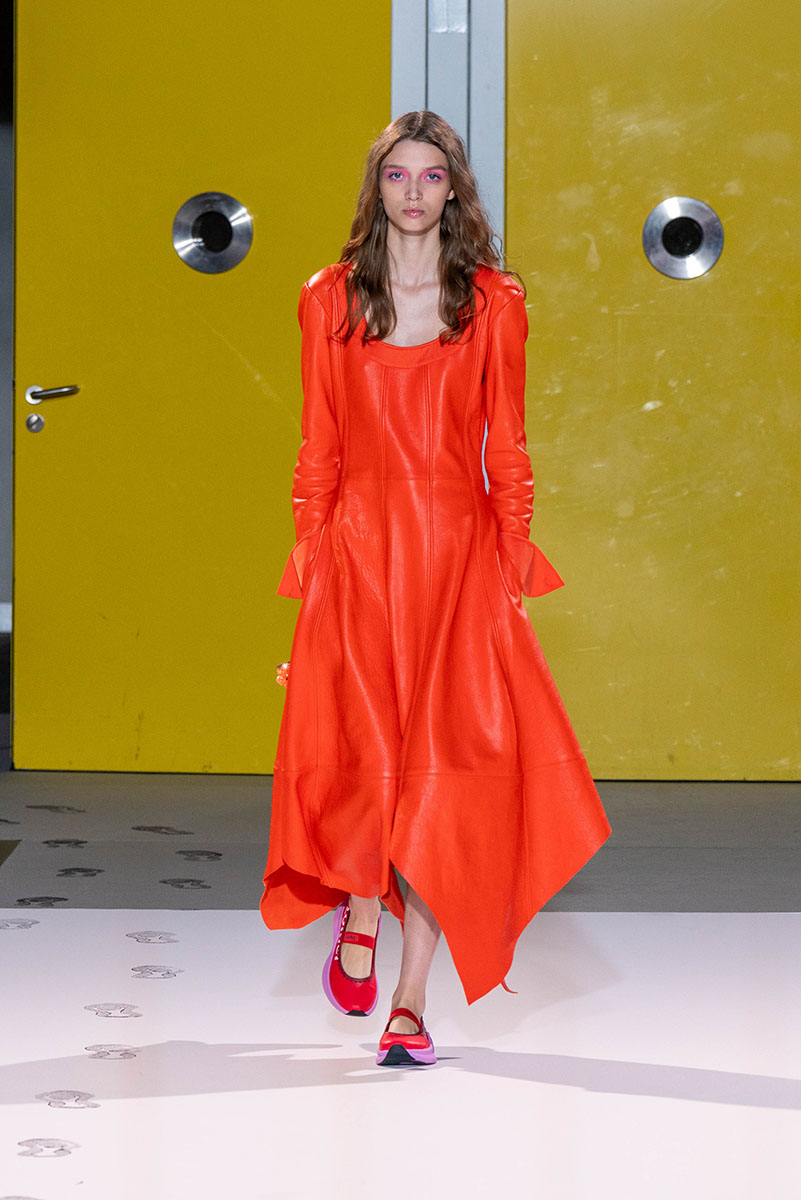 Kroje ubrań nawiązywały do dziecięcej garderoby. Zwiewne spódnice midi i spodnie zestawiono z topami, które wyglądały jak za krótkie body – jakby modelki urosły szybciej niż ich ubrania. Sukienki z jednej strony uszyto ze skóry, a z drugiej dzięki zastosowaniu drapowań, falban i dekoltów stawały się lekkie i dziewczęce. Pod szyjami nonszalancko wiązano kokardy.