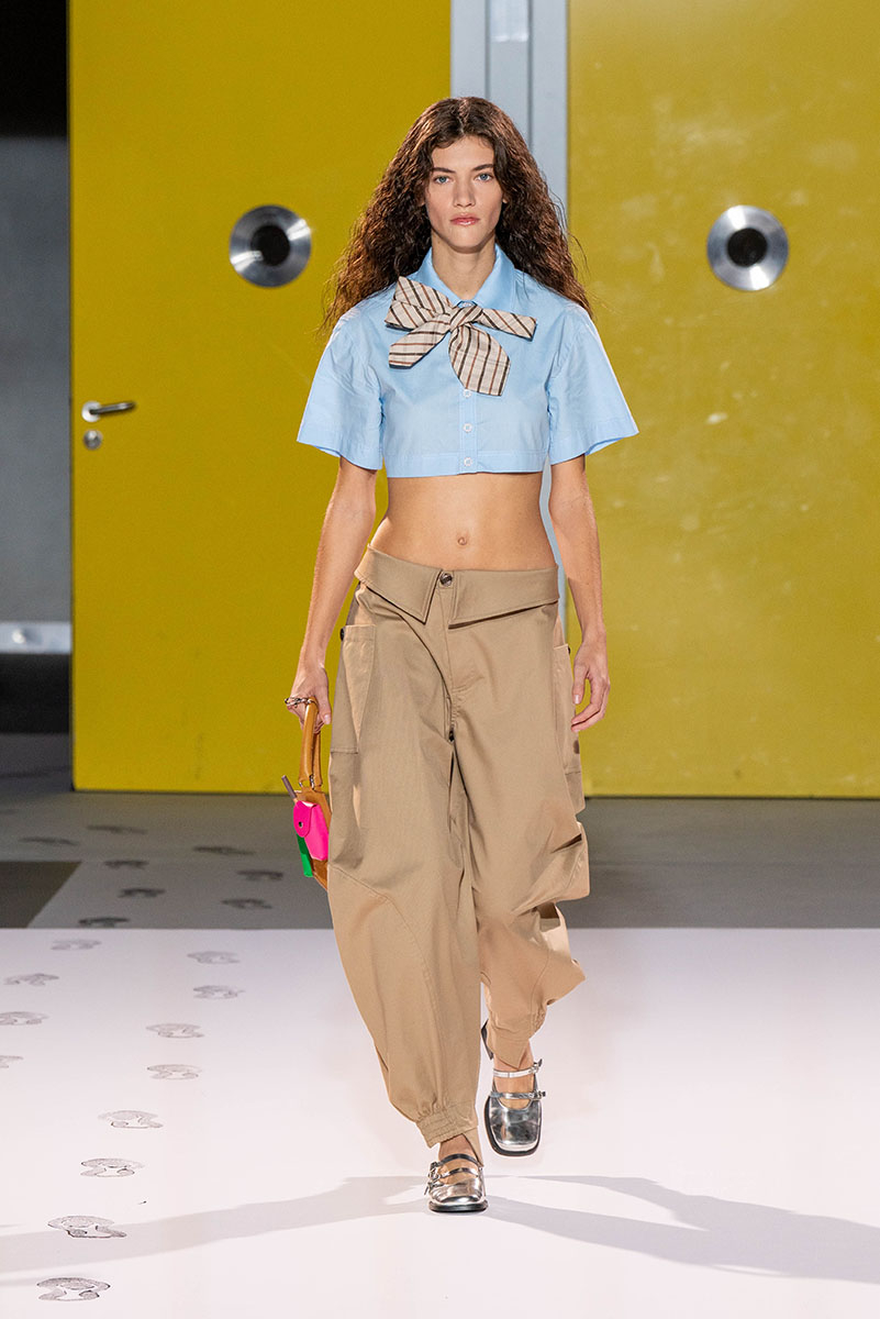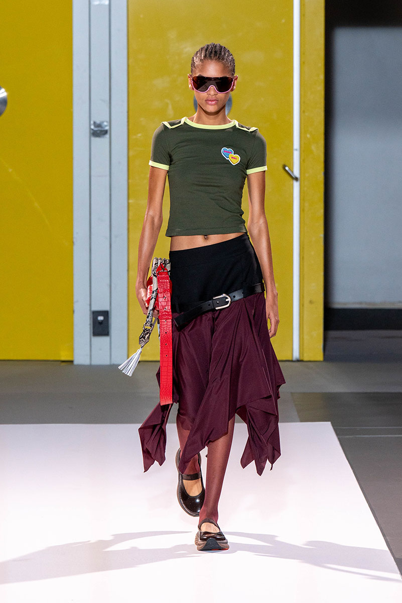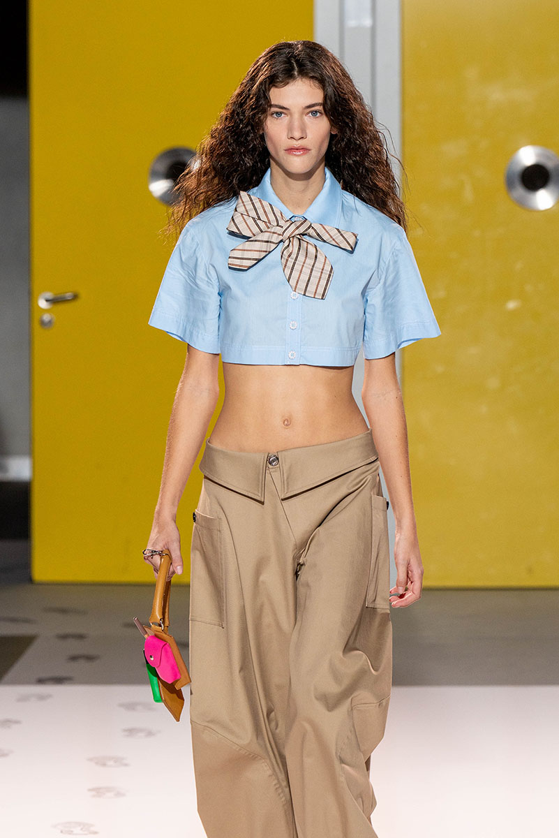 Dzianinowe body, topy i spódnice midi tworzyły feerię kolorowych pasów. Nie zabrakło też kwiatowych wzorów i satynowych sukienek – bardziej przypominających sukienki dla lalek czy piżamki niż klasyczne slip dress. Trudno nie wspomnieć o jednym z najciekawszych zabiegów stylistycznych, bezpośrednio odnoszącym się do tematu „przerastania” – przeskalowanych akcesoriach takich jak klamra od paska czy spinka do włosów.