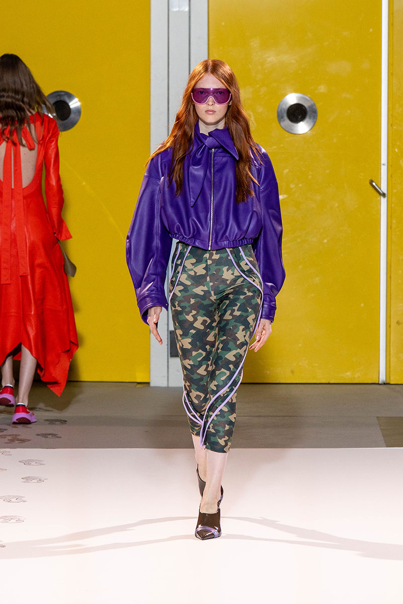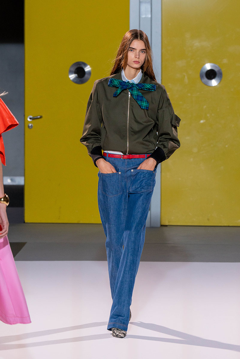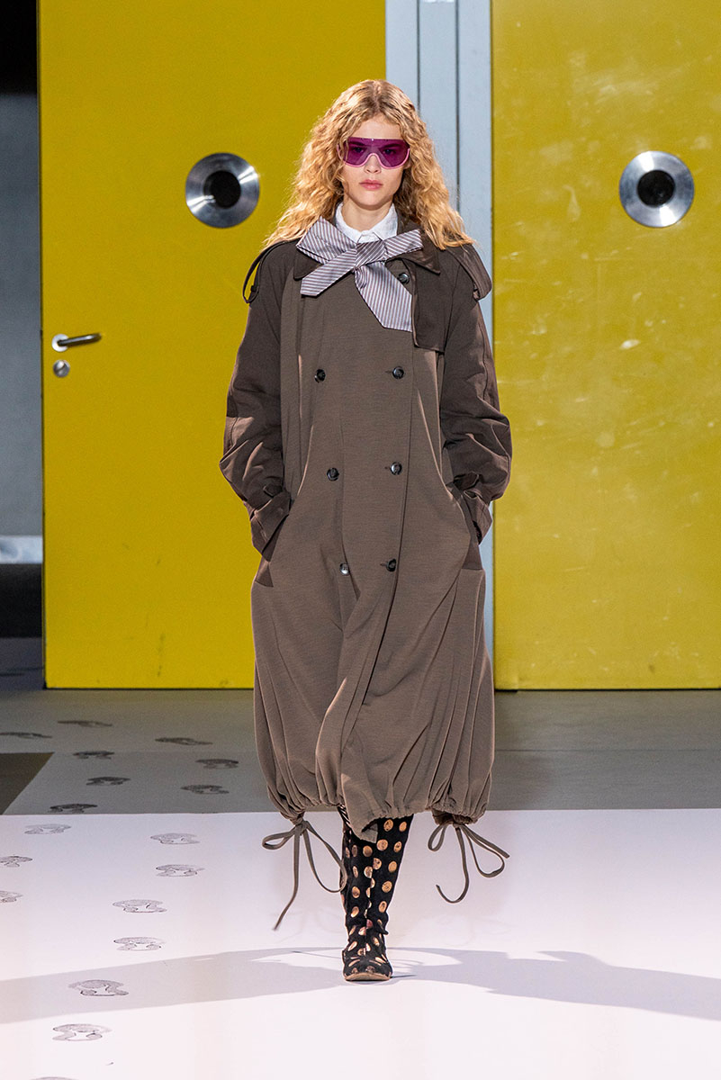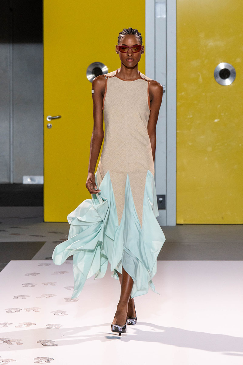 Dzianinowe body, topy i spódnice midi tworzyły feerię kolorowych pasów. Nie zabrakło też kwiatowych wzorów i satynowych sukienek – bardziej przypominających sukienki dla lalek czy piżamki niż klasyczne slip dress. Trudno nie wspomnieć o jednym z najciekawszych zabiegów stylistycznych, bezpośrednio odnoszącym się do tematu „przerastania” – przeskalowanych akcesoriach takich jak klamra od paska czy spinka do włosów.